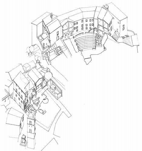 Nella parte più bassa, Palazzo Brancaleoni accoglie la sezione archeologica del Museo Civico. Nella parte centrale l’ex-chiesa di S. Chiara diviene auditorium e, alla sommità dell’acropoli, nell'antico refettorio settecentesco viene realizzato il centro regionale di scienze teatrali applicate che ha come fulcro la sala ipogea da 200 posti ricavata sotto il cortile.