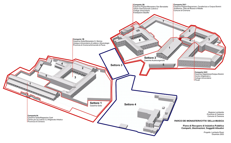 Tra questi i due Parchi dei grandi siti monastici semi abbandonati del settore occidentale del centro storico.Le due aree di undici ettari, si configurano come nuove porte urbane da cui si dipartono itinerari tematici legati alla Musica e alla Liuteria. Si delinea così una “città della musica” diffusa di struttura multipolare che si sovrappone all’organismo urbano saldando il centro storico alle aree di espansione recente.